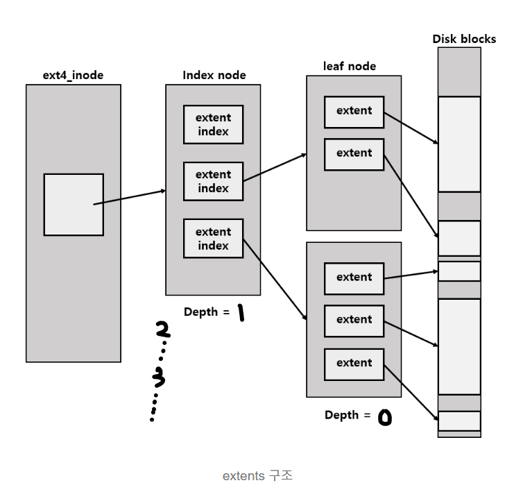 이에 대한 효율이 떨어져서 NTFS의 클러스터런 구조처럼 블록들을 연속적으로 묶어서 관리하는 방법인 Extent tree 구조를 채택하게 되었다.