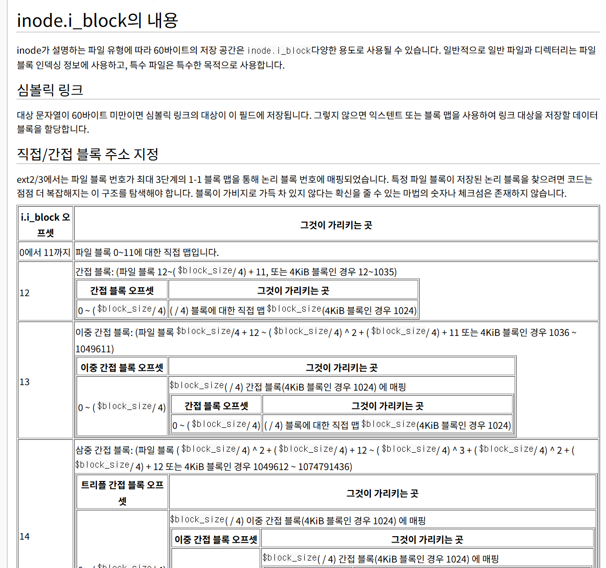 (근데 만약 ext4가 아니라 ext2,3 이라면 inode.i_block 영역은 직접, 간접 블록 주소 지정 영역으로 사용된다 이건 https://archive.kernel.org/oldwiki/ext4.wiki.kernel.org/index.php/Ext4_Disk_Layout.html#The_Contents_of_inode.i_block 를 활용해서 확인해보면 어디서부터 어디까지 해당 오프셋이 블록 지정 주소값을 가지는지 알 수 있다 현재는 ext4를 기준으로 포스팅 할 것 이다)